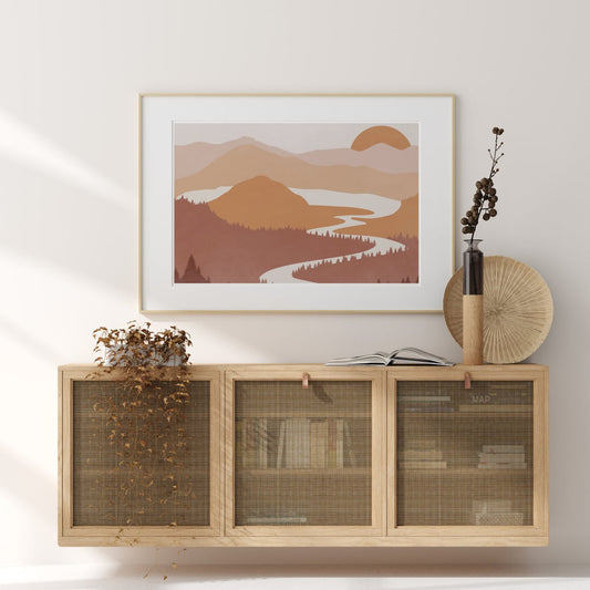 Poster orizzontale stile nordico - Montagne e fiume al tramonto rosso mattone