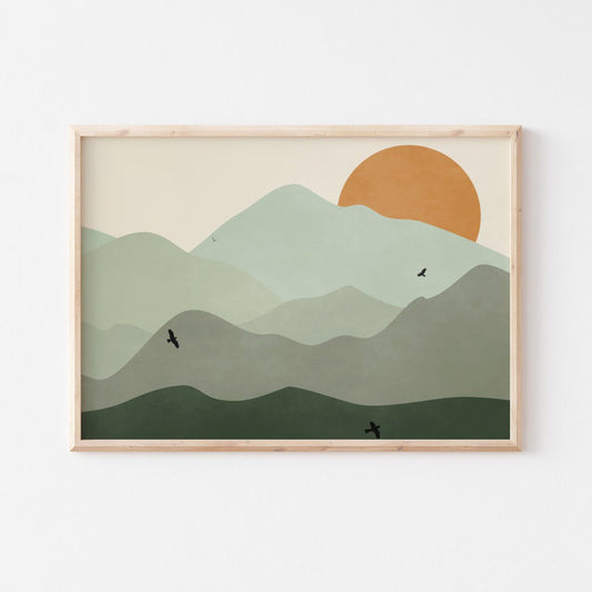 Poster orizzontale stile minimal - Montagne al tramonto verde salvia
