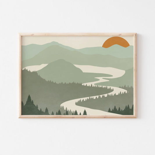 Poster orizzontale stile nordico - Montagne e fiume al tramonto verde salvia